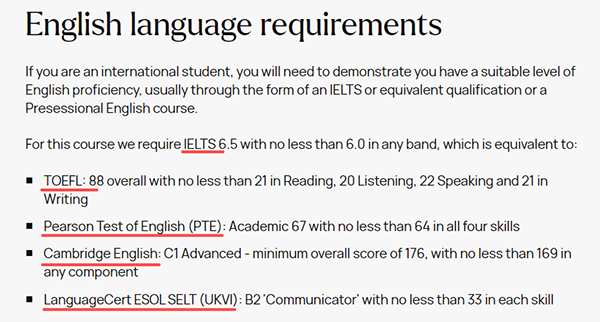 除了雅思,英国硕士也接受托福、PTE、剑桥英语等等具有同等效力的语言成绩。但是无论选择哪一种,都必须要提前的、有针对性的准备,避免因为语言未达标而错失录取名额。