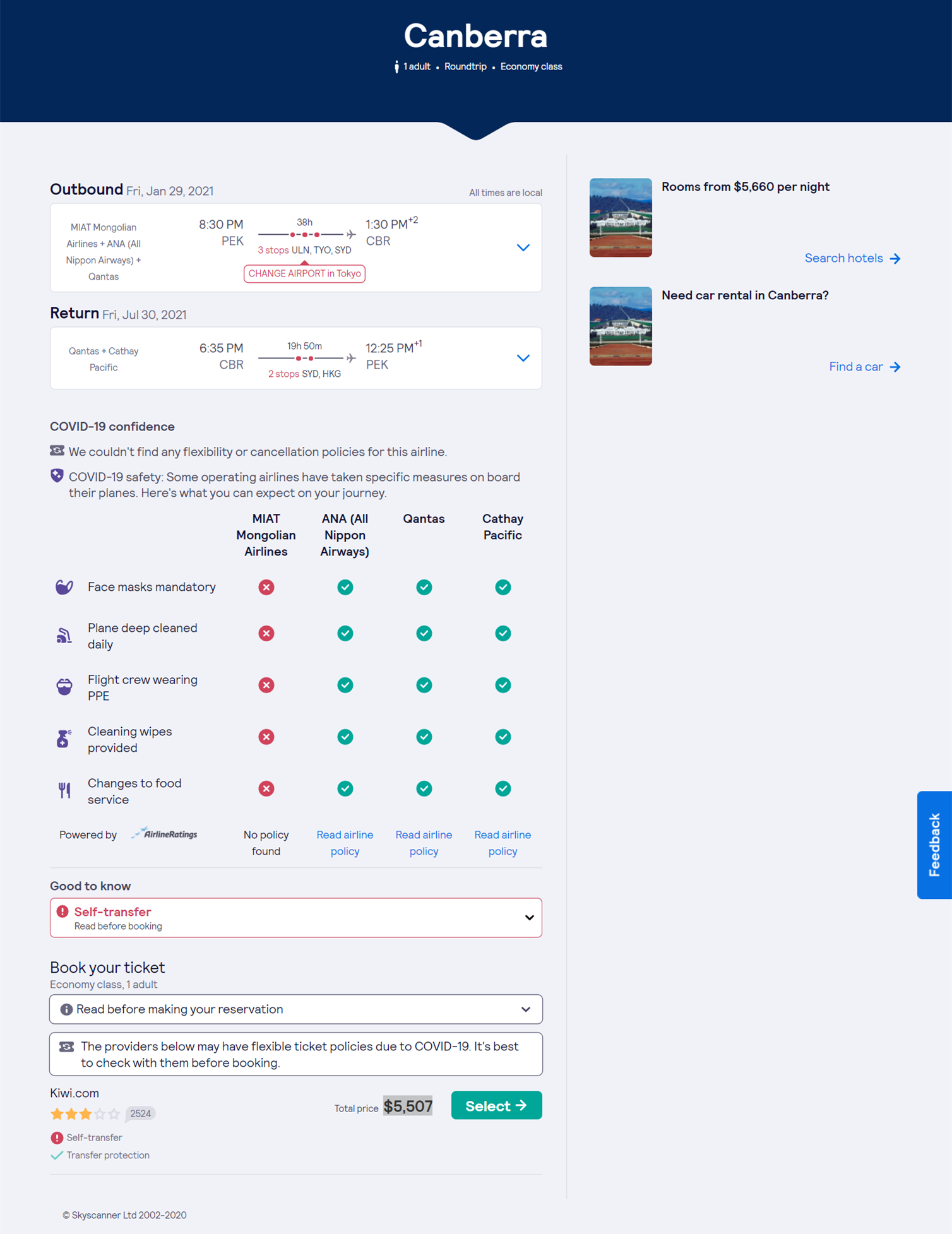 中国北京飞澳洲堪培拉的机票往返费用:$5507≈36,087.81RMB(1 USD = 6.5531 CNY)