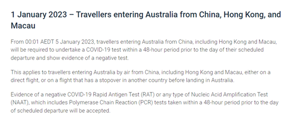 值得关注的入境信息还包括,从 2023 年 1 月 5 日星期四开始,澳大利亚政府要求对从中国(包括香港和澳门)前往澳大利亚的人进行 COVID-19 出发前检测。且必须在旅行前 48 小时内进行 COVID-19 检测,并在前往澳大利亚时出示阴性检测结果证明文件。