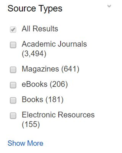 使用来源类型来限制你的搜索。如果你只关注学术文章,请勾选“学术期刊”框。其他可用类型包括贸易出版物、会议材料和报告。单击显示更多以查看结果列表中的所有来源类型。