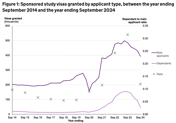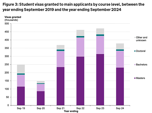 英国留学市场从峰值时接近50万人(精确数据为2022年7月至2023年6月间498,068个留学签证),下降到不足40万人(精确数据为2023年10月至2024年9月间392,969个留学签证),降幅21.1%。