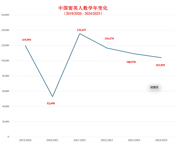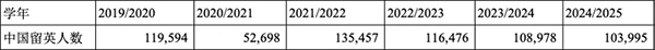 2024/2025学年,中国留英学生接近10.4万人(精确数据为2023年10月至2024年9月间103,995个留学签证),超过印度学生,占英国国际学生总量的26%。